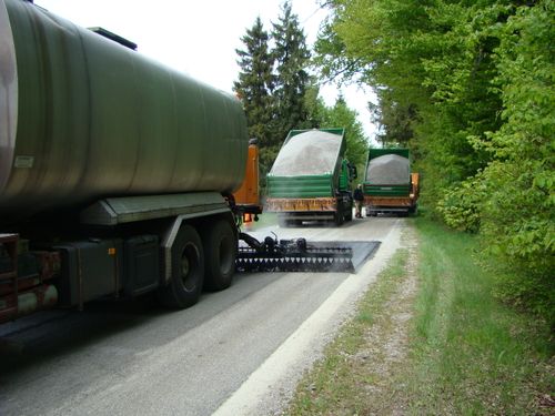 Aufbringen der Bitumenemulsion für die zweiten Lage, anschließend Abstreuen mit Splitt